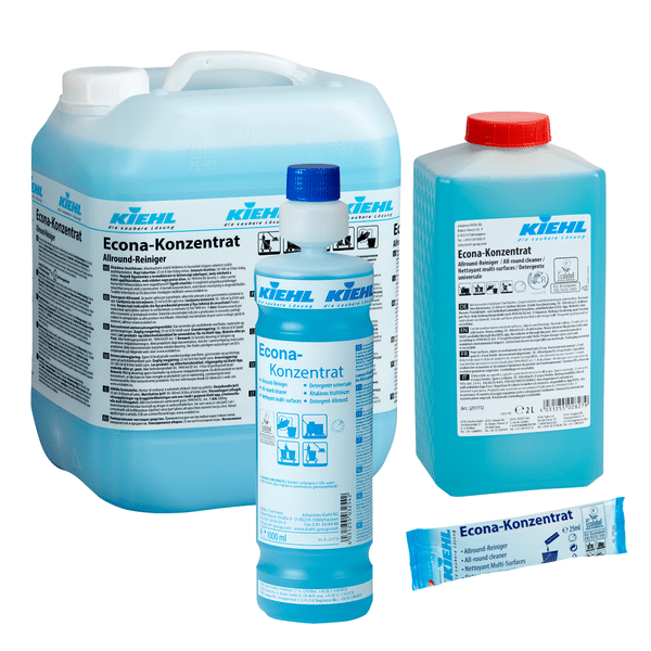 ECONA-CONCENTRE est un détergent concentré universel Ecolabel idéal pour le nettoyage quotidien des surfaces, objets et revêtements de sols résistants à l'eau. Peut aussi être utilisé comme nettoyant intensif. Pouvoir nettoyant élevé en faible concentration d’application. Respecte les matériaux, séchage rapide et sans traces.