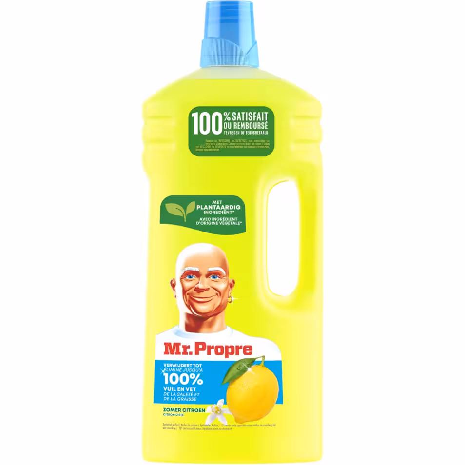 Le nettoyant multi-usages Mr Propre élimine jusqu'à 100 % des saletés et graisses pour un résultat ultra brillant. Adapté aux sols, aux plans de travail de cuisine et aux surfaces dures et lavables Ne laisse pas de traces ni de résidus dangereux A base d'ingrédients d'origine végétale, sans conservateurs ajoutés, eau de javel ou ammoniac Fraicheur intense Citron d'été